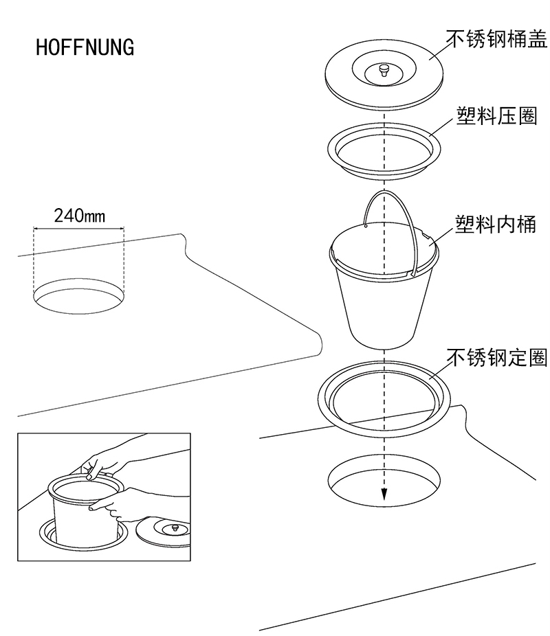 台面嵌入式垃圾桶 免弯腰橱柜内置圆形厨房厨柜垃圾桶