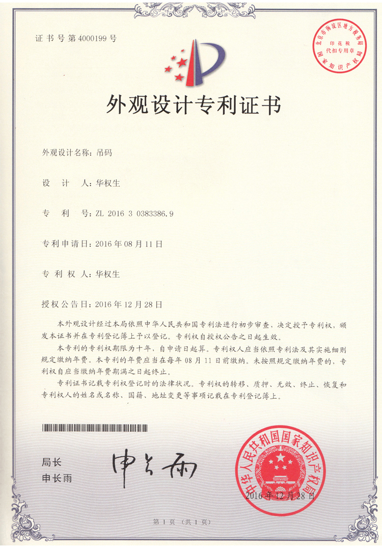 HOFFNUNG重型吊码金属大吊码获得专利授权。颁发专利证书