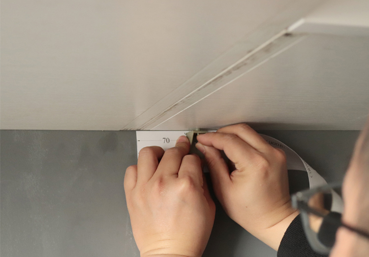 安装模板贴到墙壁。用螺丝将固定件安装到柜底